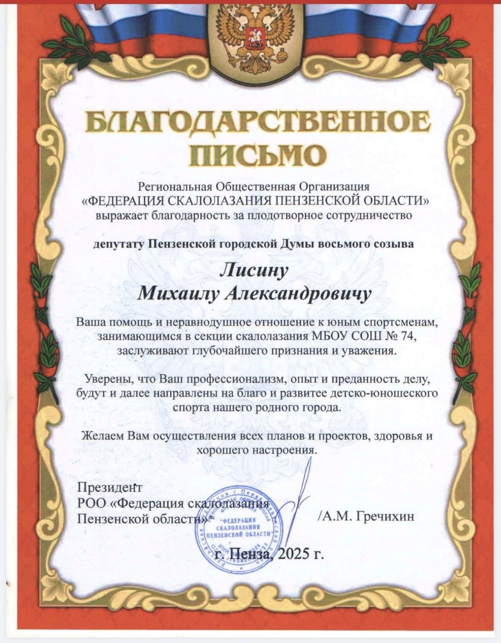 Сегодня хочу поделиться радостной новостью: благодаря реализации программы исполнения наказов избирателей, школа №74 города Пензы получила новые спортивные сооружения для занятий скалолазанием.