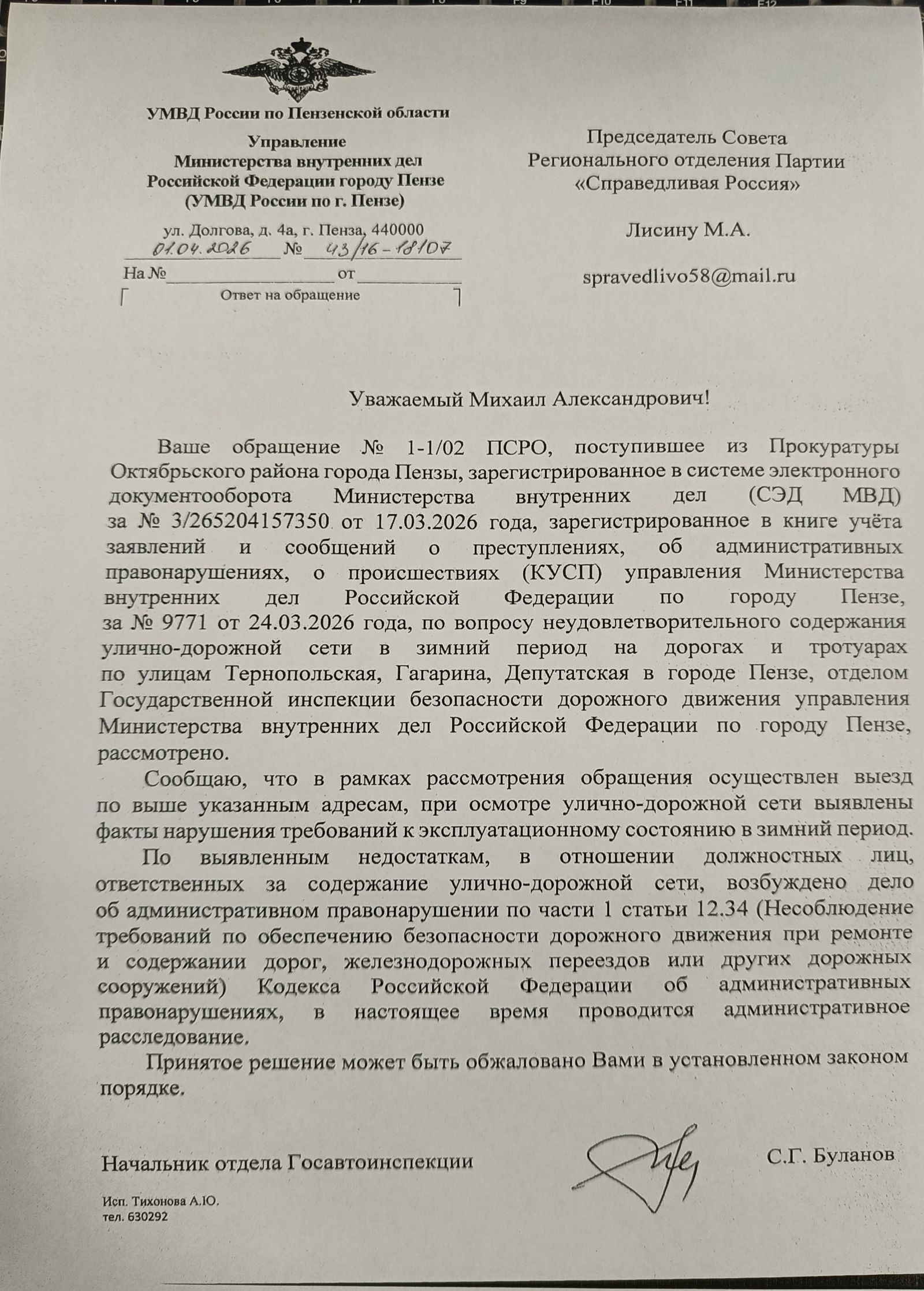 Так, не успели мы пожаловаться на дорожных инспекторов в посте от 3 апреля за полное игнорирование нашего обращения по нечищеным дорогам, как 6 апреля – вуаля! – в почте обнаружилось письмо из Госавтоинспекции УМВД России по городу Пензе. Случайная неслучайность? Если бы! Как оказалось, промедление было вызвано особенностями процессов цифровизации в отдельно взятом регионе! Ну вы поняли – торопиться не надо. Классика!